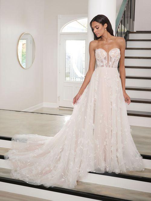 Add to CompareThis beautiful Christina Wu gown boasts a plunging sweetheart neckline, with beaded straps crossing over at the small of the back. Featuring a full A-line skirt with a long train, and a detachable beaded belt to style to your preference.