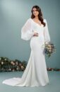 Add to CompareThis ivory, all over lace gown features an illusion neckline and deep V back. The waist has been delicately trimmed with a fashion forward, sheer ladder trim placed at the natural waist. The skirt has a sweep train.
